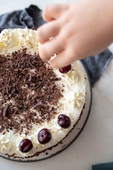 Black Forest cake with layers of chocolate cake, whipped cream, and cherries, flavored with kirsch (cherry brandy).